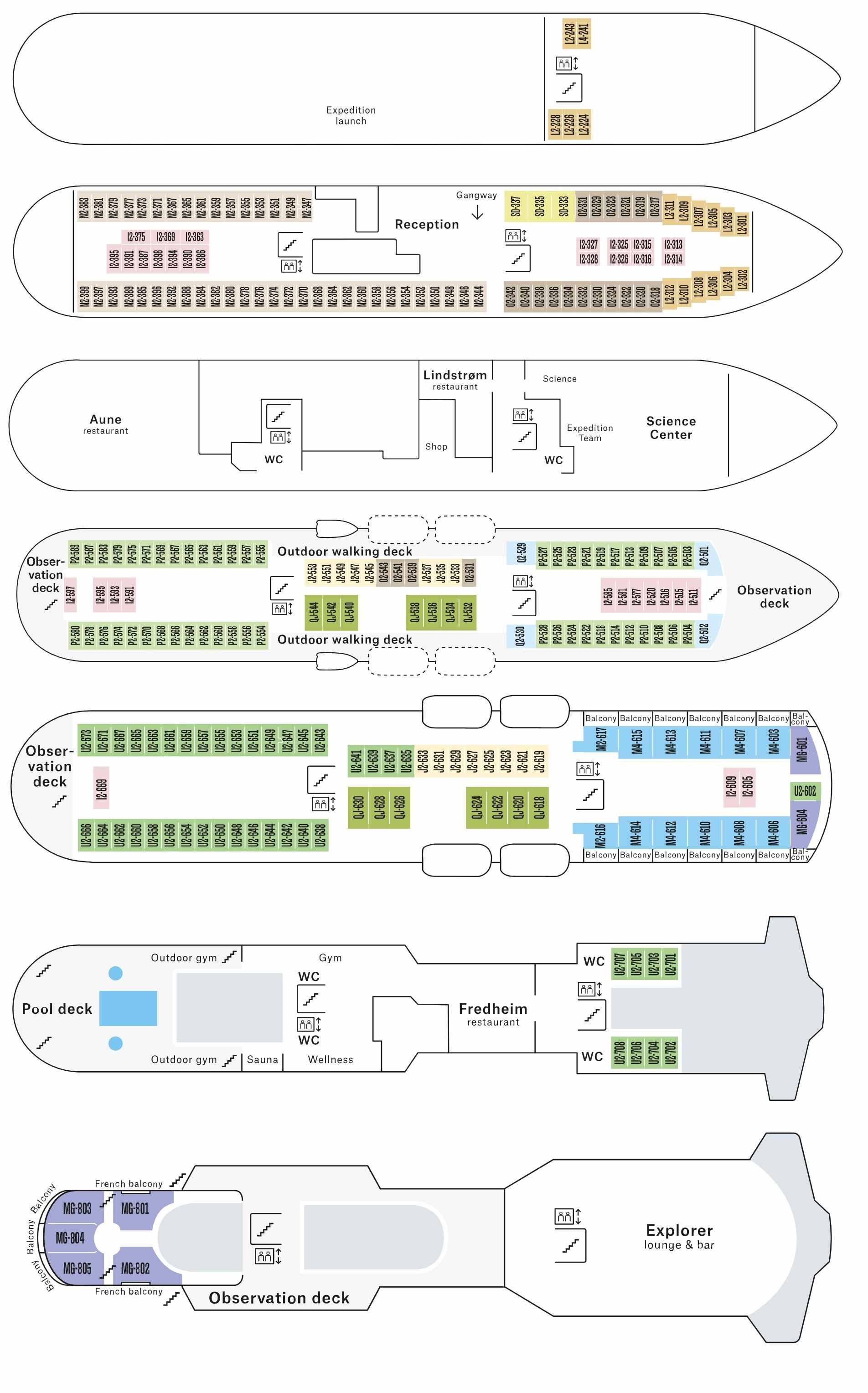 • Vonkajšie kajuty Arctic Superior U2: 10 - 12 m². Neotvárateľné okno; na 6. a 7. palube, kúpeľňa so sprchou a WC, Tv. Manželské alebo oddelené postele.