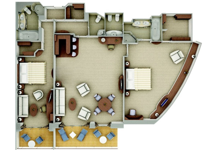 R2 - Royal Suite 2 105-110 m² + balkón 16-17 m². Royal Suite R1 spojená s Veranda Suite. 6,7. paluba vpredu. Max 5 osôb. 36 600 € 18 300 € za osobu