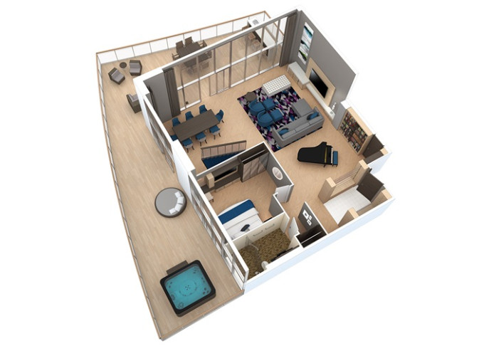 | L1 - Crown Loft Suite s balkónom 50 m² + balkón 10 m². 2-podlažný apartmán. 17. paluba. Max 4 osoby. Výhody Royal Suite Sky Class. | 10 341 € 3 447 € za osobu | ||