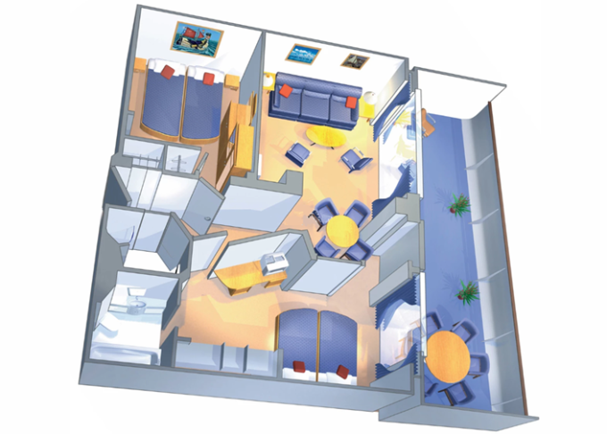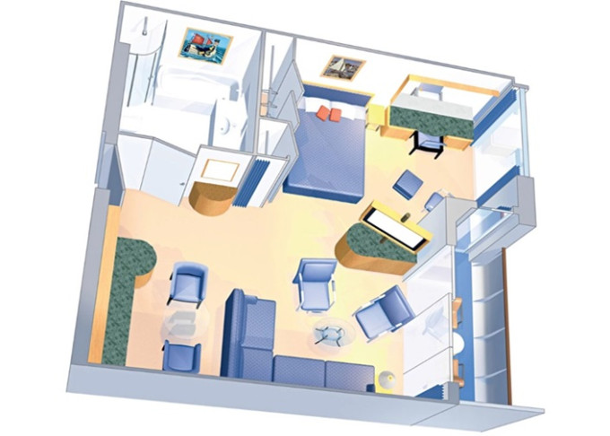 VP - Ocean View Panoramic Suite (bez balkónu) 38 m². Panoramatické neotvárateľné okná. 12. paluba. Max 6 osôb. Výhody Suite. 7 696 € 1 924 € za osobu