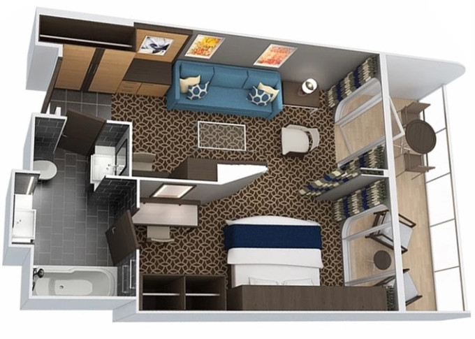 | 2U - Vnútorná kajuta s virtuálnym balkónom 15,5 m². Obrazovka veľkosti balkónových dverí s premietaným výhľadom. Centrálne umiestnenie. Max 2 osoby. | 4 302 € 1 434 € za osobu | ||